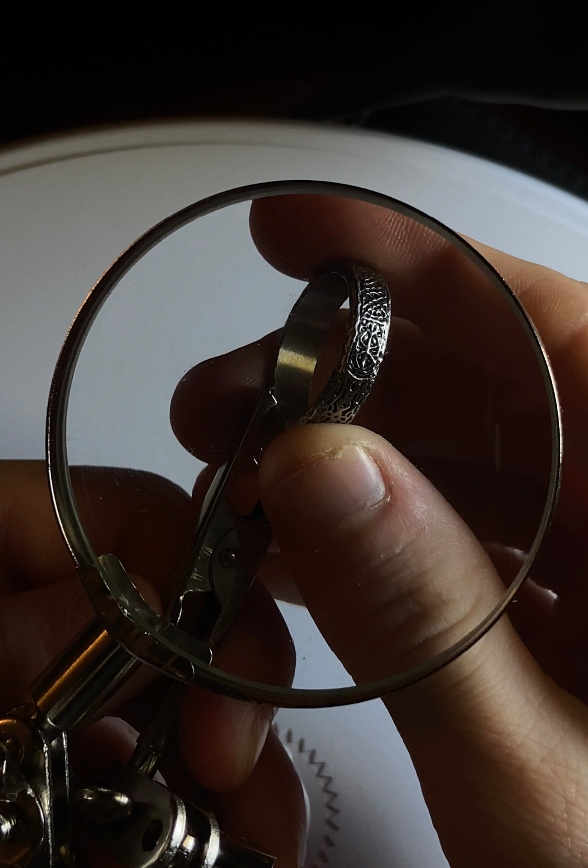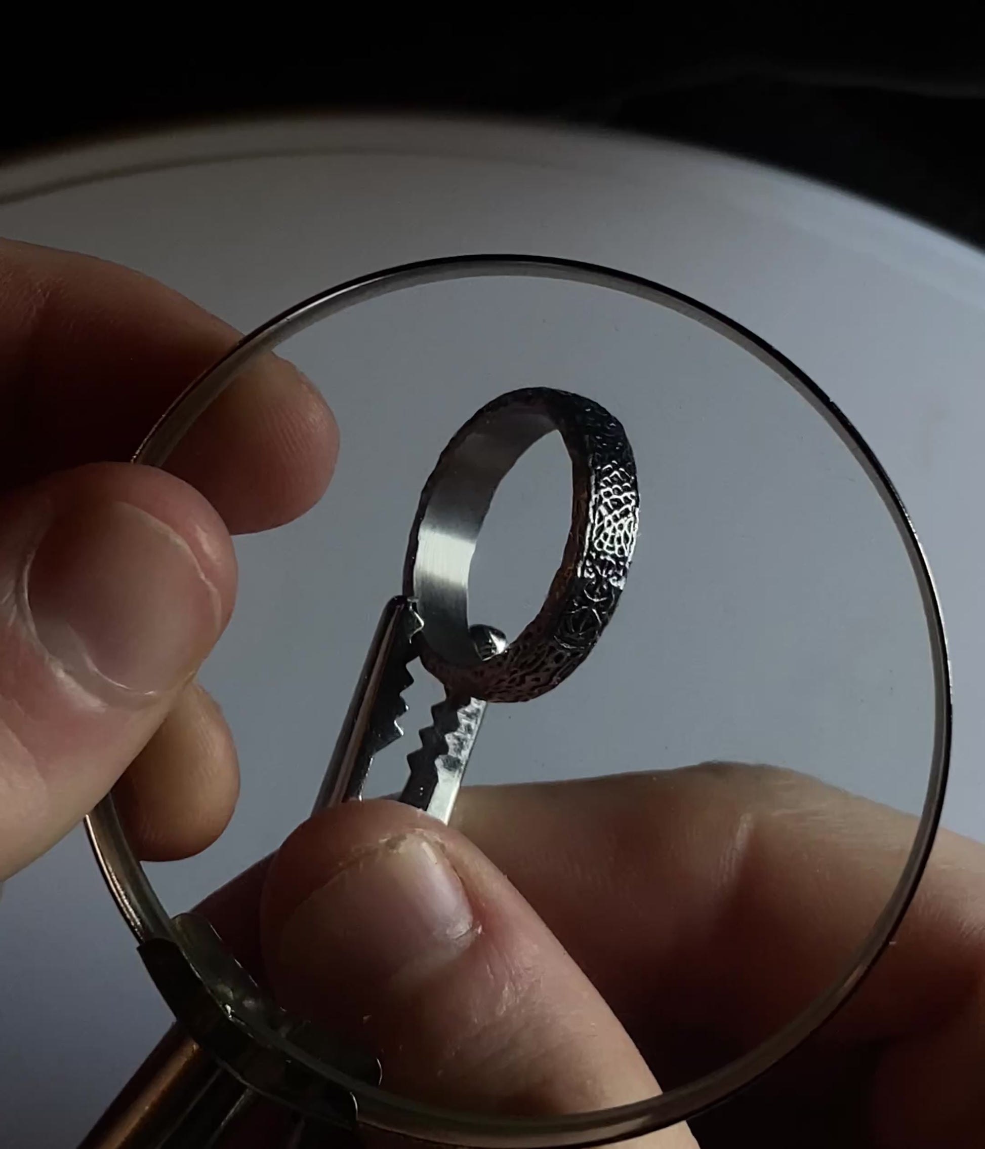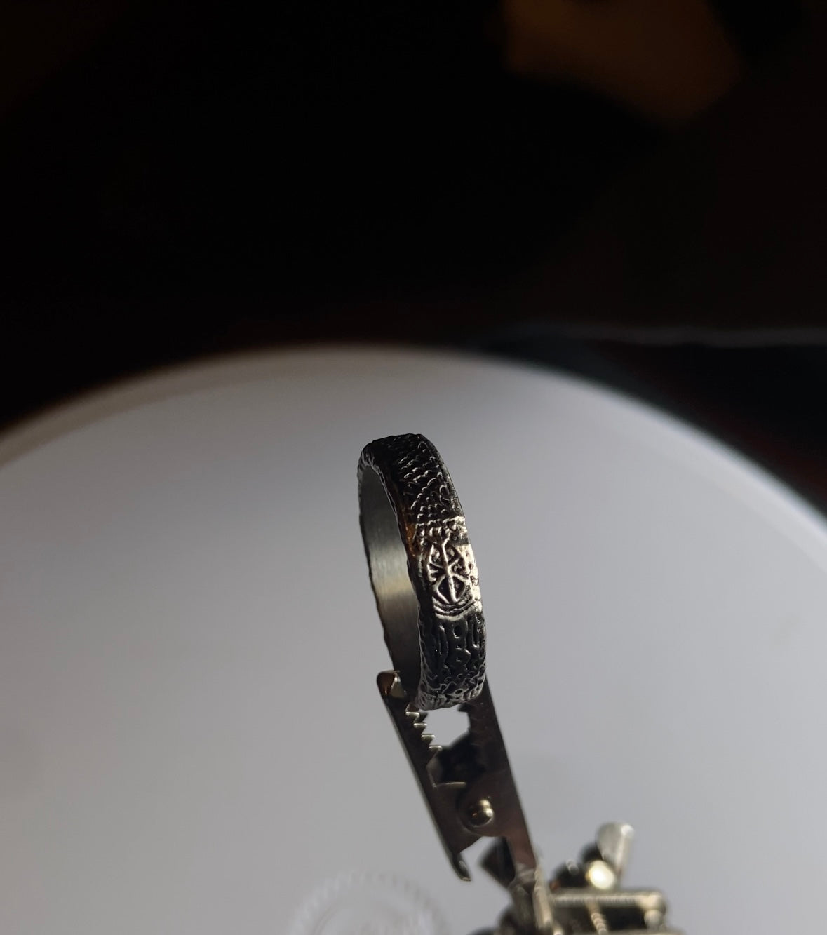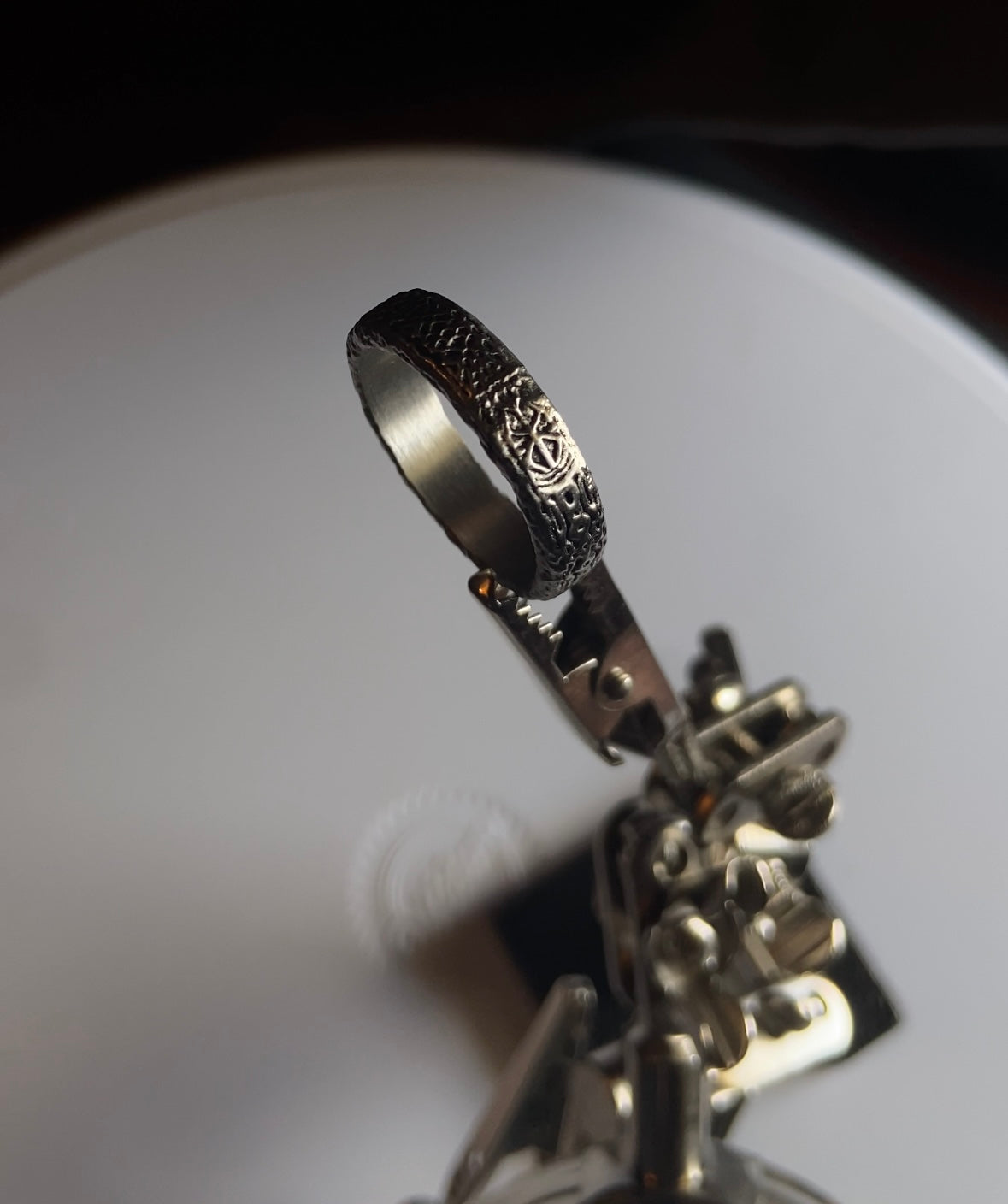 - Tarnished Creases: Deliberate tarnishing enhances the ring's depth, adding a vintage, worn look that complements the symbol’s haunting significance.